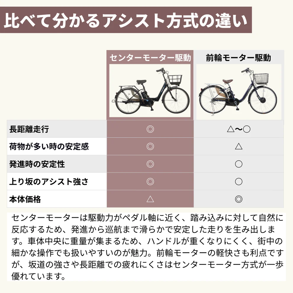 一漕ぎ目からセンターモーターならではのアシストの強さを実感していただけます。